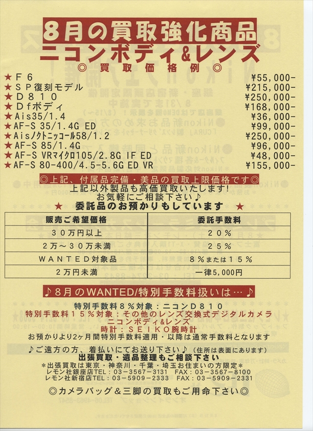 8月の買取強化商品(カメラ) ニコンボディ&レンズ