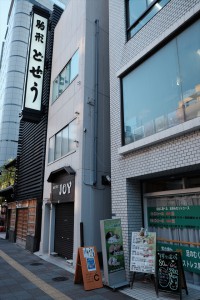 あいぽんの地図だと「駒形どぜう」の近くなんだけど、それらしき雰囲気のお店は見当たりません・・・周辺をぐるぐる探しておりますと・・・細い路地を発見、そばにオレンジ色の看板が!
