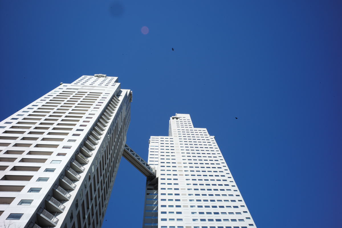 レンズをやや下方に下げて撮影しましたがディストーションは抑えられないのと、隅田川の川面の湾曲が認められます。